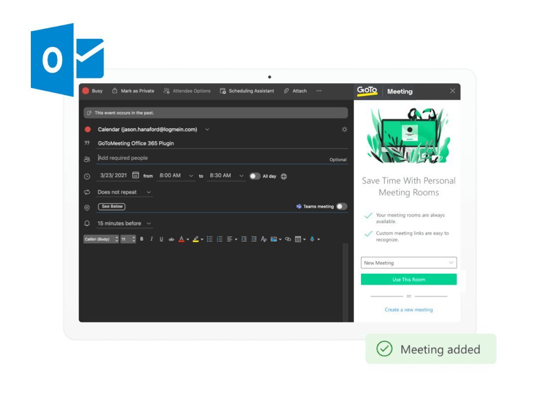 Utilisez le plug-in GoTo Meeting pour Outlook afin d’intégrer votre salle GoTo Meeting personnelle avec Microsoft Outlook. Une fois le plug-in installé, vous pouvez planifier vos réunions depuis Outlook.